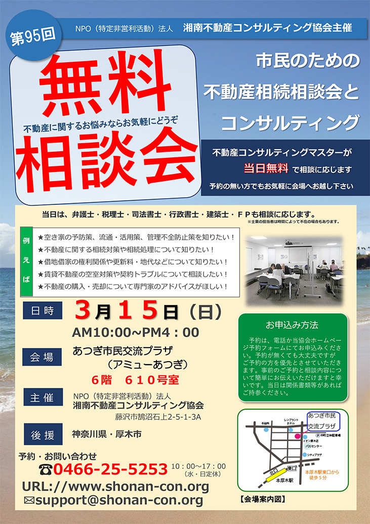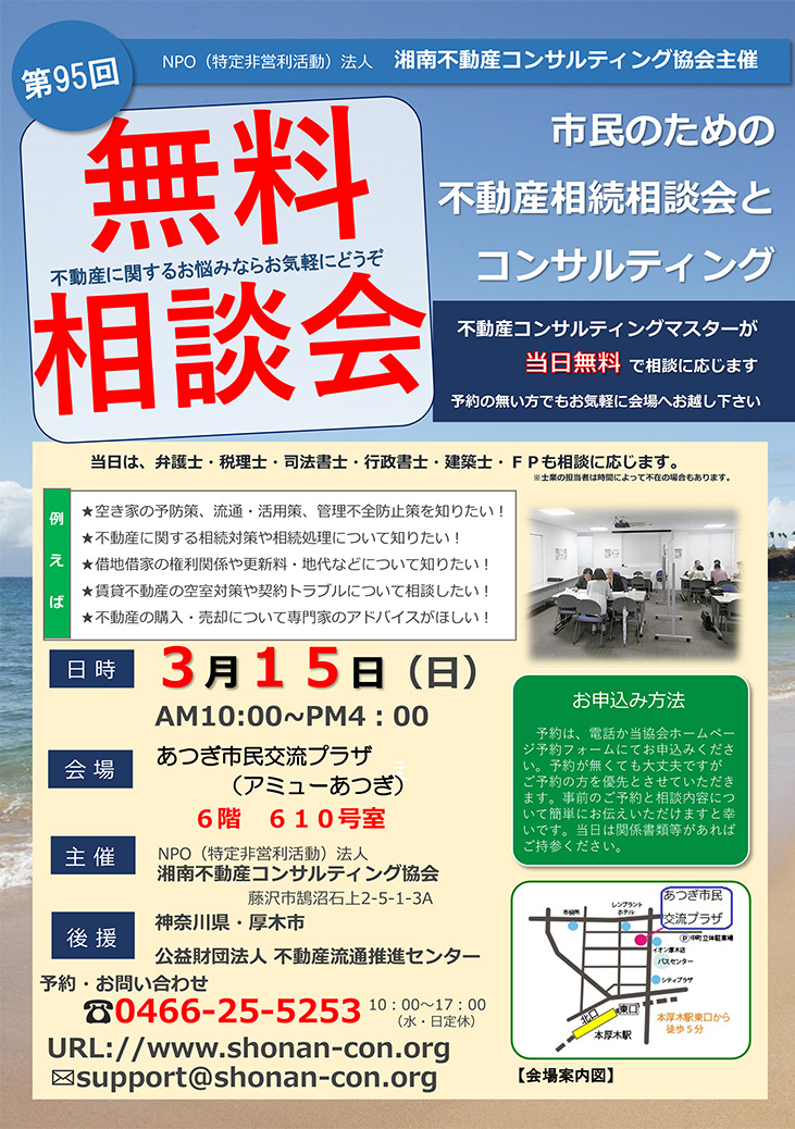 2025年3月23日(日)『あつぎ市民交流プラザ(アミューあつぎ)6階 610号室』にて不動産無料相談会を開催いたします。