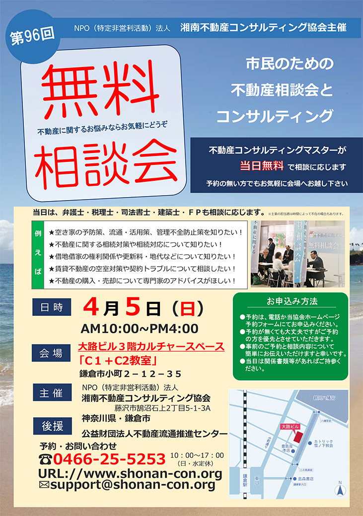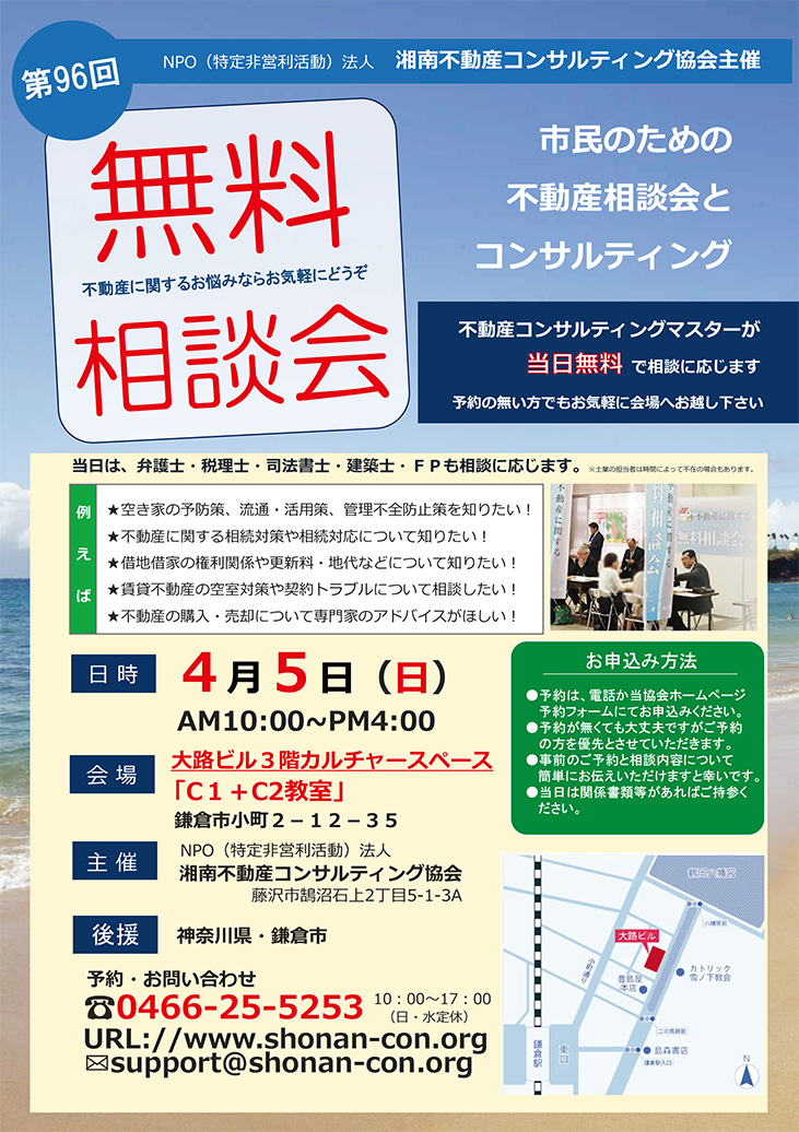 2025年4月13日(日)『鎌倉生涯学習センター きらら鎌倉第6会議室(4階)』にて不動産無料相談会を開催いたします。